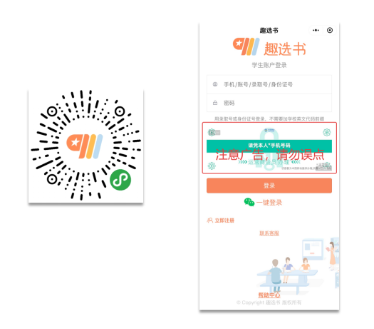 1. 登录:扫码 “趣选书”小程序或者在微信中直接搜索“趣选书”进入公众号或者小程序。